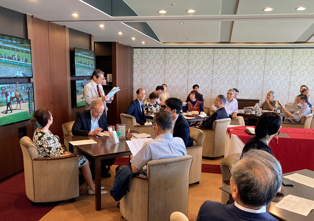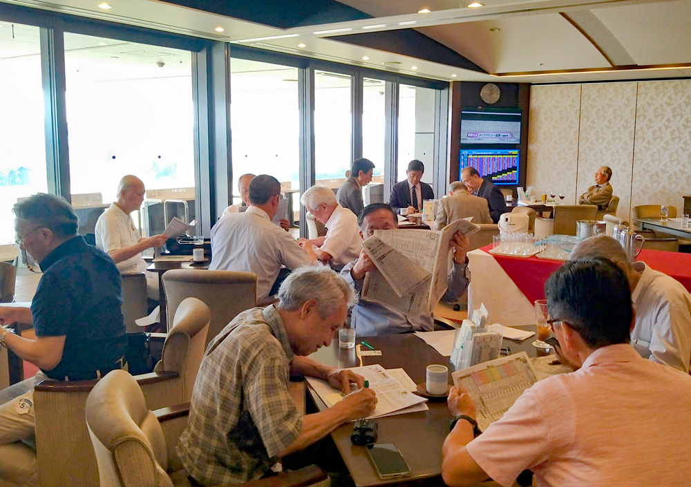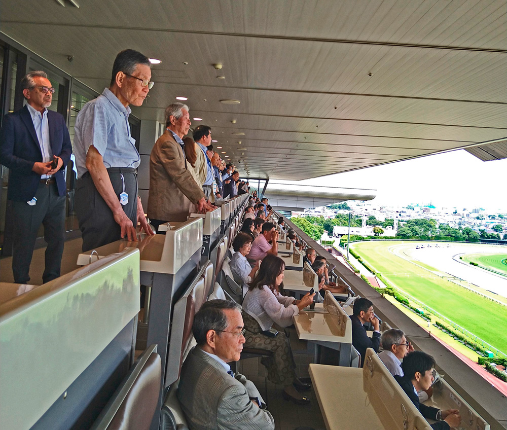 当日は、10時に競馬場正門に集合。来賓受付で、ドレスコードチェックを受けてダービールームに入室、大野正道府中校友会長の開会挨拶のあと、皆さんは早速、勝馬検討、競馬観戦に入りました。レースが始まると、観戦スタンドに移り、馬券を手にお気に入りの馬を声援、レース終了後は、レース分析と「反省会」が各テーブルで、くり広げられました。