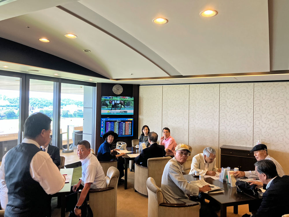 観戦に先立ち、鈴木正明府中校友会長の挨拶、稲門祭記念品購入のお願い(小村裕稲門祭実行委員)、暑気払いの宴など今後の会イベントのご案内(大野真美副会長)が行われたあと、参加者の皆さんは、待ちに待った競馬観戦に入りました。