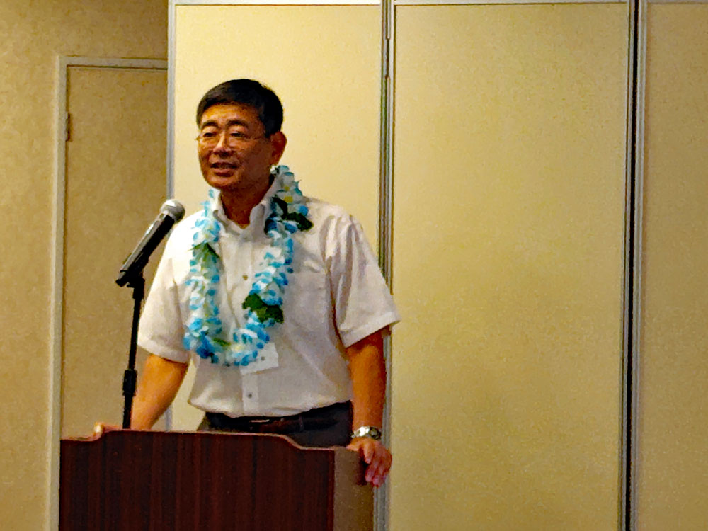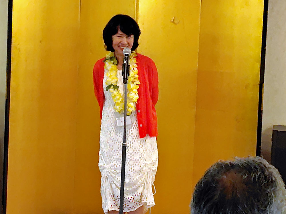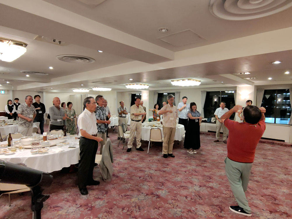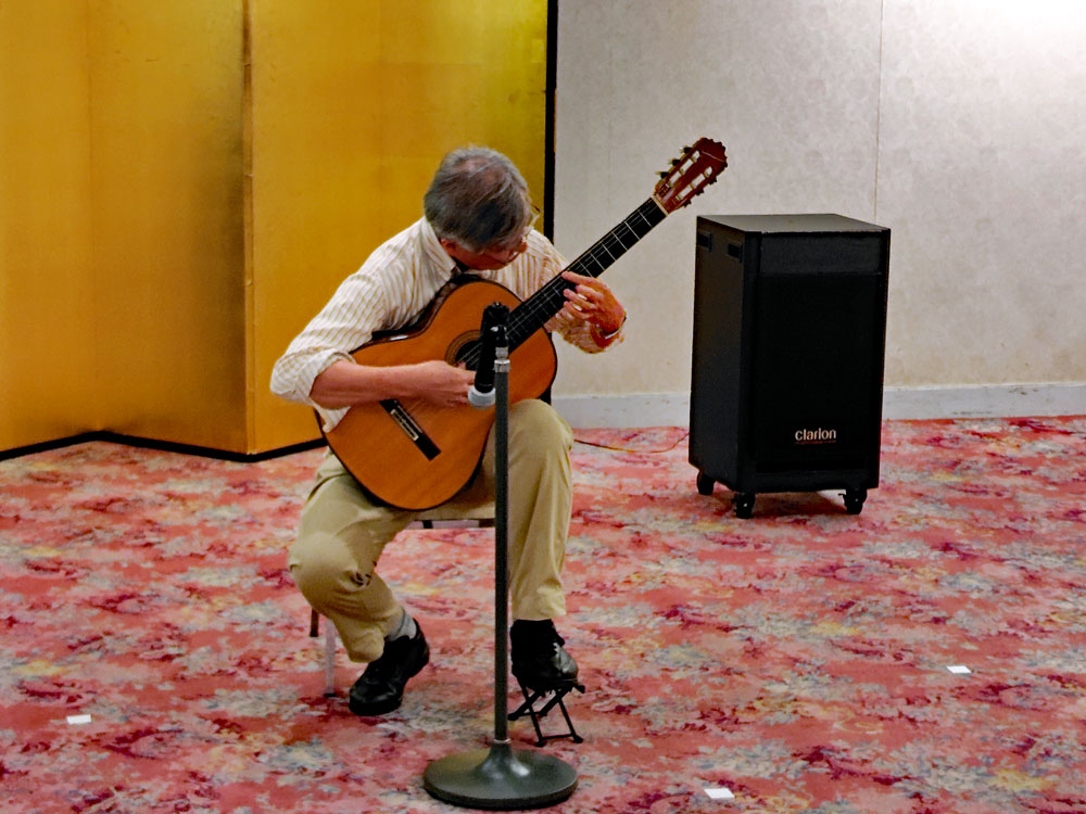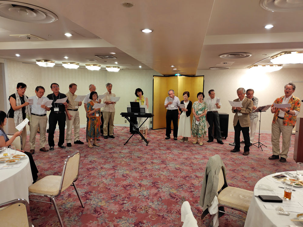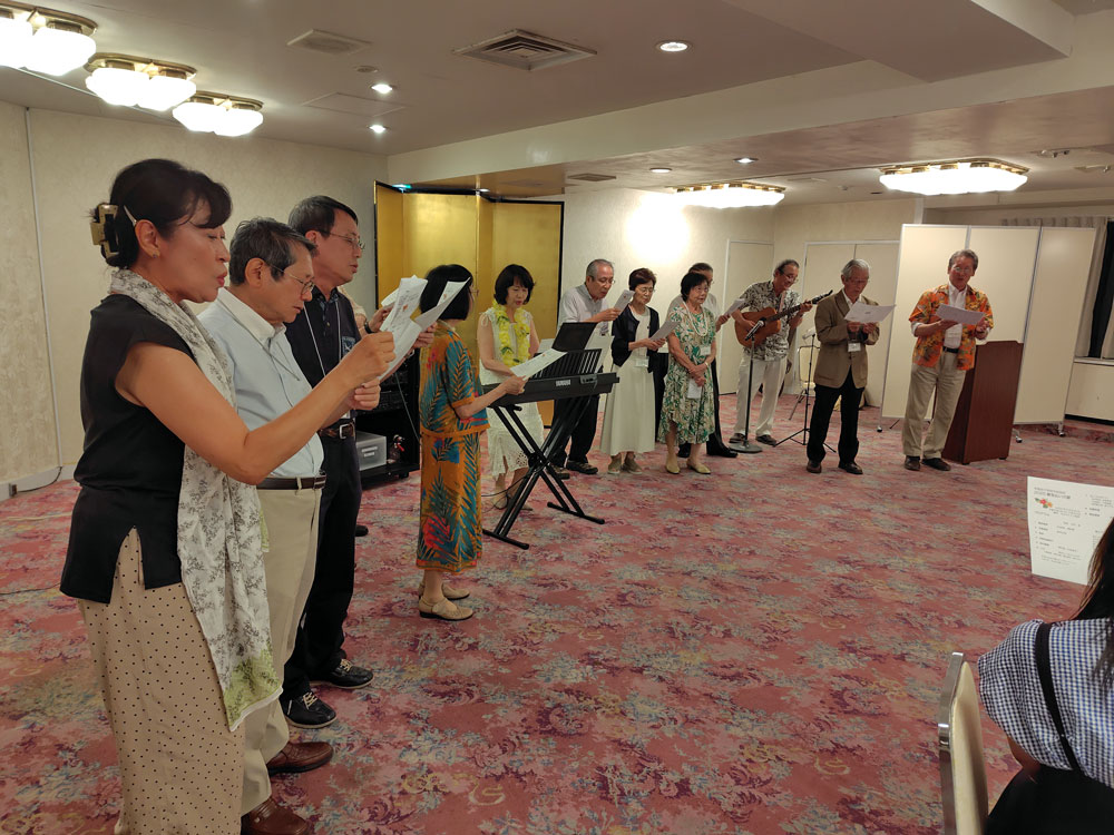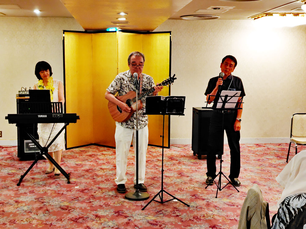 松井さんによるギター独奏「アルハンブラの思い出」、古曳さんのギターと歌「青葉城恋歌」、平野さんと塙夫妻による「青春」、塙(宏)の「白いパラソル」、そして音楽愛好会全員による「芭蕉布」、これは昨年お亡くなりになった大野正道前会長が大好きだった歌なので心を込めて歌いました。
