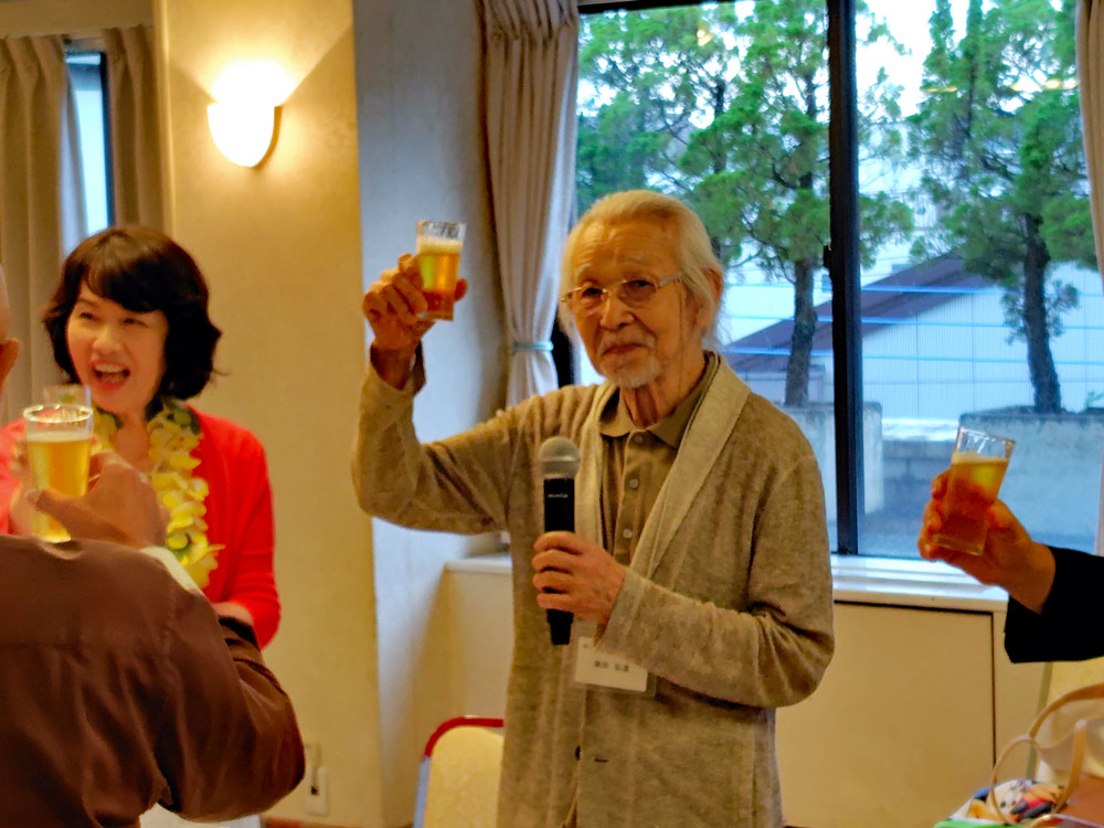 小村さんの司会により、担当幹事の開会挨拶、鈴木会長の挨拶、そして乾杯の音頭は今年91歳の大先輩柴田さん、とてもお元気な姿と力強い挨拶に感激しました。