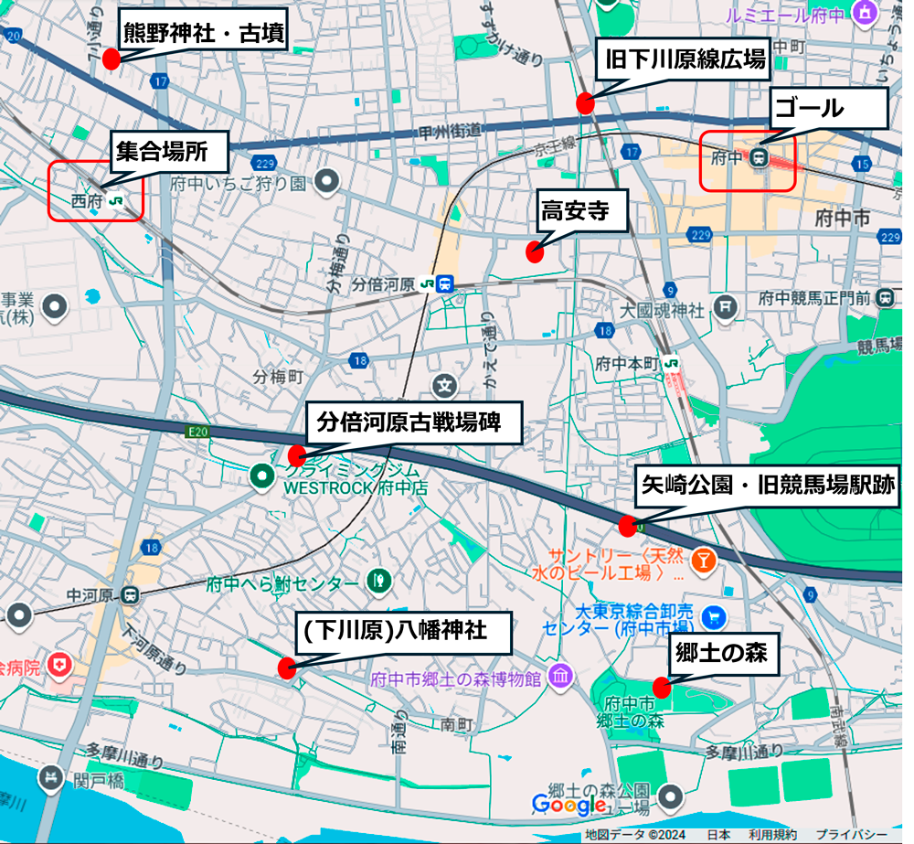 | 八幡神社・旧下川原鉄道碑→府中郷土の森→下川原線分岐点→ 矢崎公園・旧競馬場駅跡→下川原線分岐点→ 高安寺・足利尊氏・弁慶→旧下川原線広場→⇒京王線府中駅 *見学、休憩入れて3時間コース。歩行距離 7,260M。 |