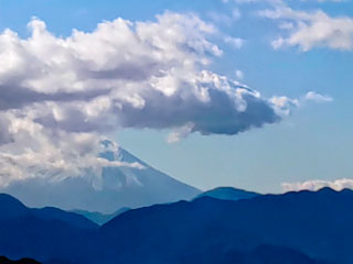 山頂(標高599m)に到着したのはほぼ正午。生憎と富士山は雲がかかってましたが、稜線は一部見ることができました。山頂での写真を添付します。