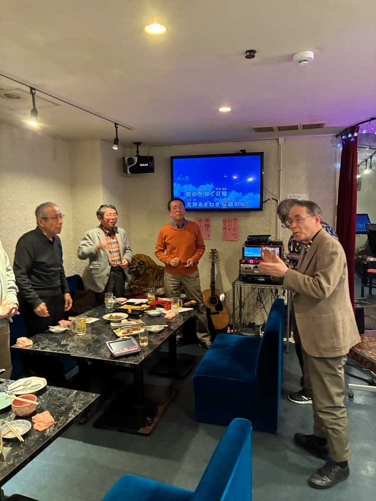 今年最後の音楽愛好会の集まりは、忘年会も兼ねて飲食付きで3時間行いました。「音楽を楽しむ」コンセプトは変わらず、乾杯からスタートです。