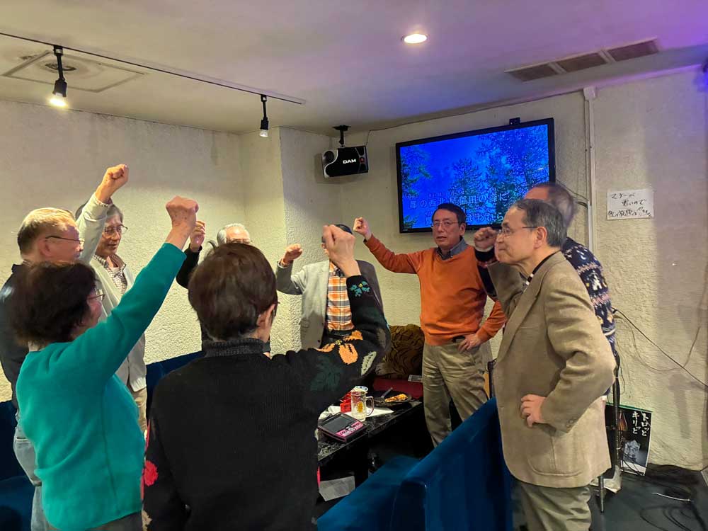 WASEDAタイムは、カラオケ伴奏で「紺碧の空」と「早稲田大学校歌」を声高らかに歌い、古曳さんのエールで終了しました。