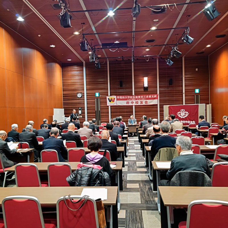 2024年度総会は11月30日(土)14時30分からルミエール府中コンベンションホール飛鳥で開催されました。総会には府中校友会会員40名が出席。また大学本部及び三多摩支部各稲門会から計18名の方に来賓として臨席頂きました。