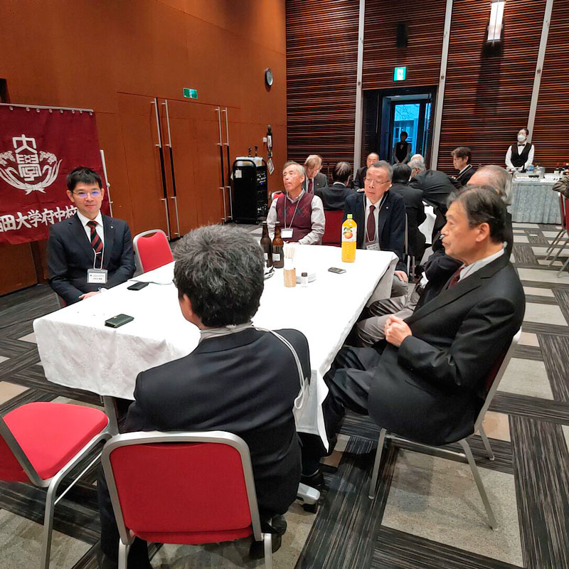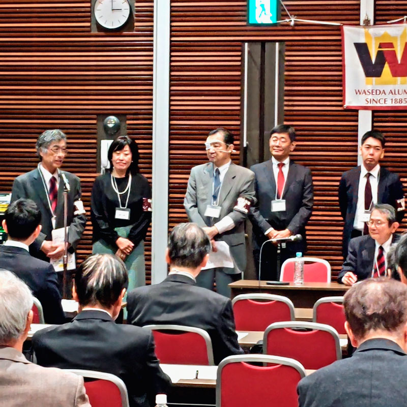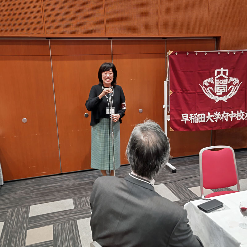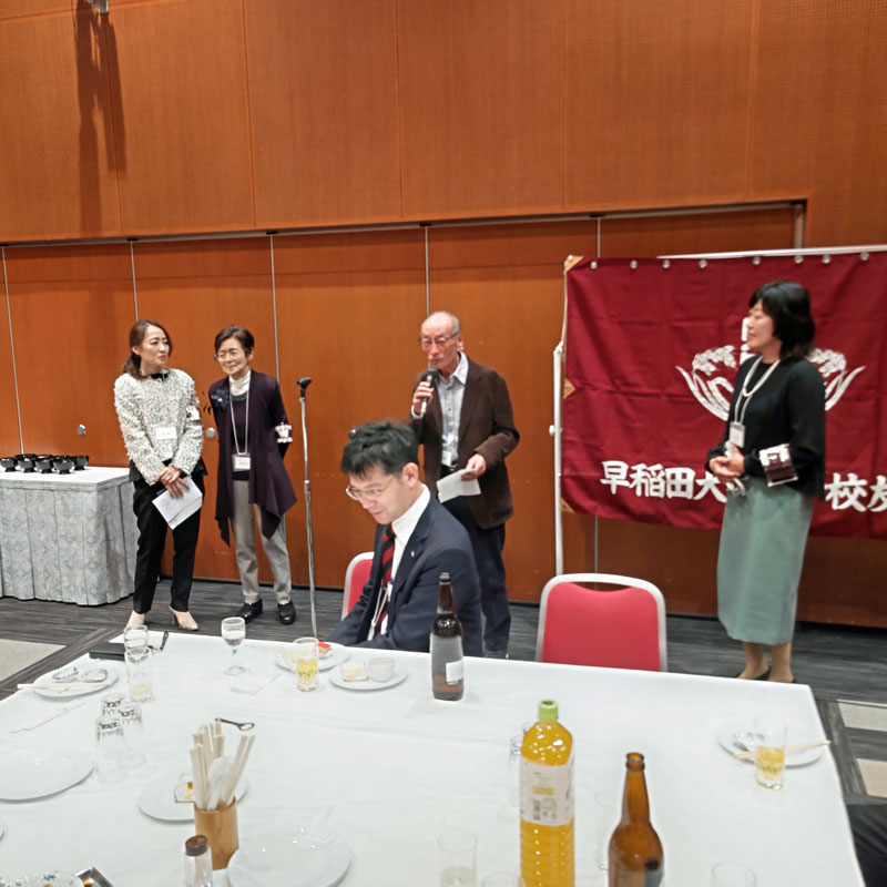会の締めには岡野勝会員のパフォーマンスにより参加者全員で校歌「都の西北」を斉唱。最後に、新事務局長に就任された西村弘美さんによる閉会挨拶でお開きとしました。