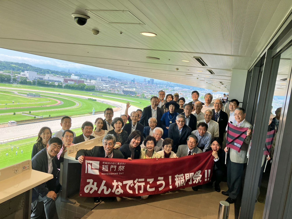 レースが始まると、来賓室前の専用スタンドで馬券を手にお気に入りの馬を声援、レース終了後は、「馬券反省会」と次レース研究が各テーブルで、くり広げられました。昼休憩時には、稲門祭紹介の横断幕をかかげ、参加者全員で記念写真を撮影しました。