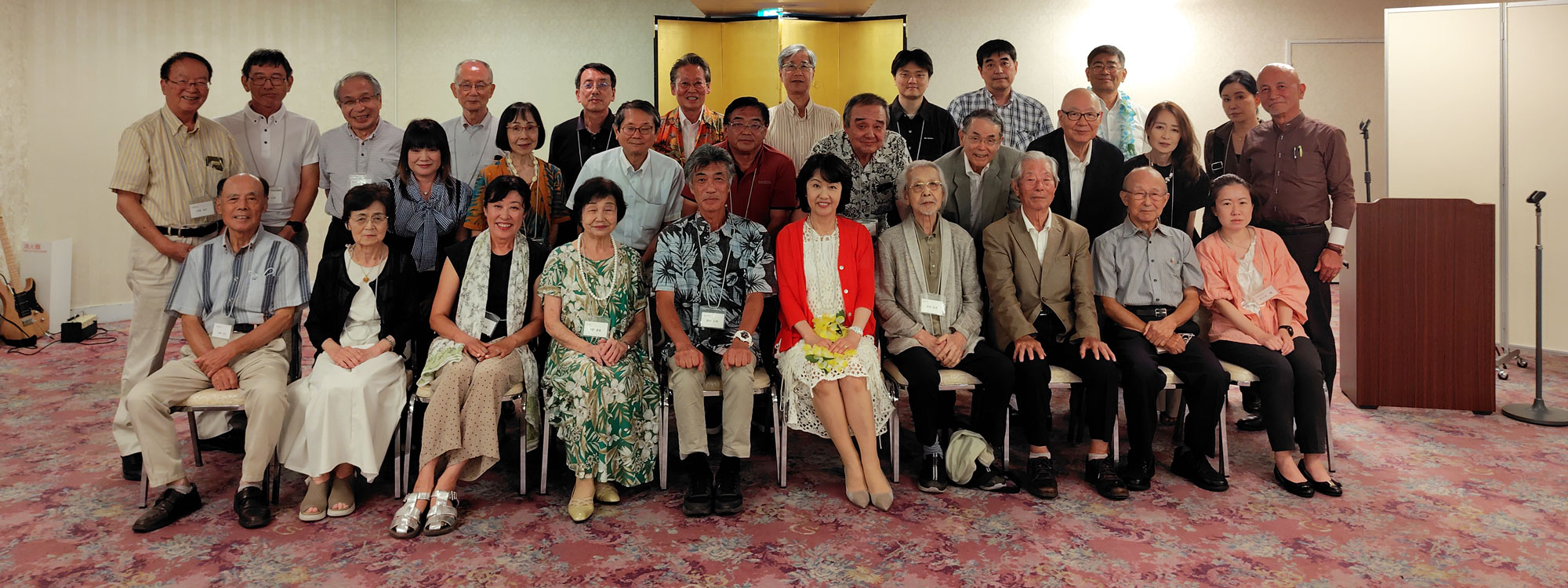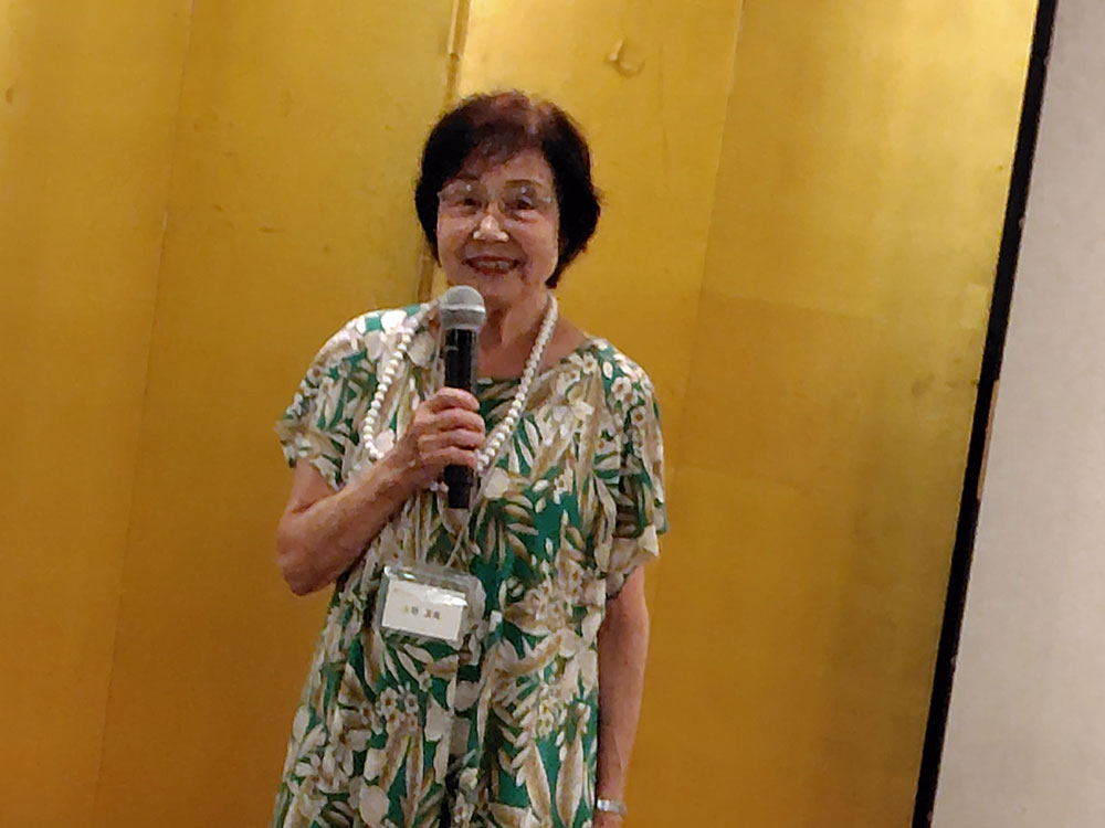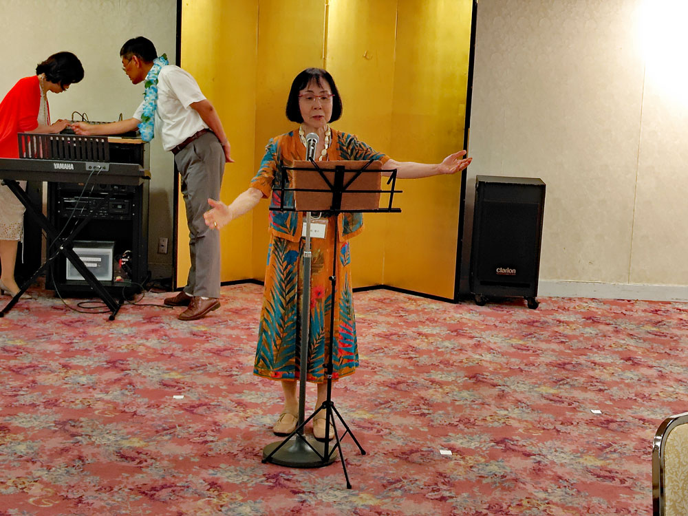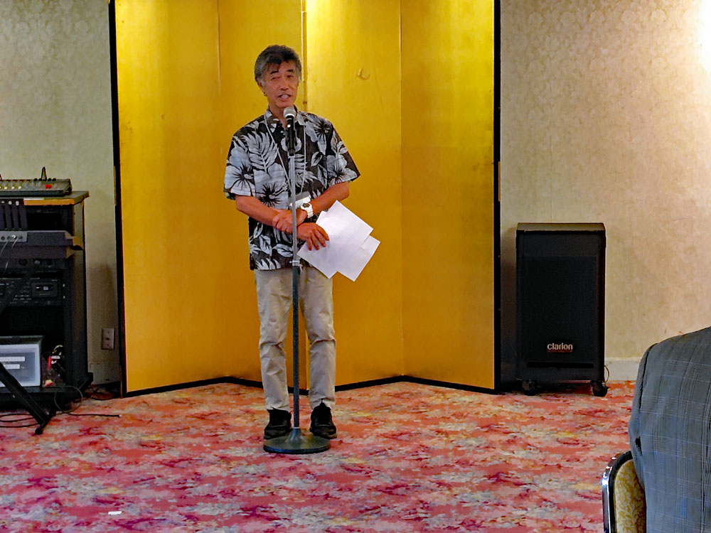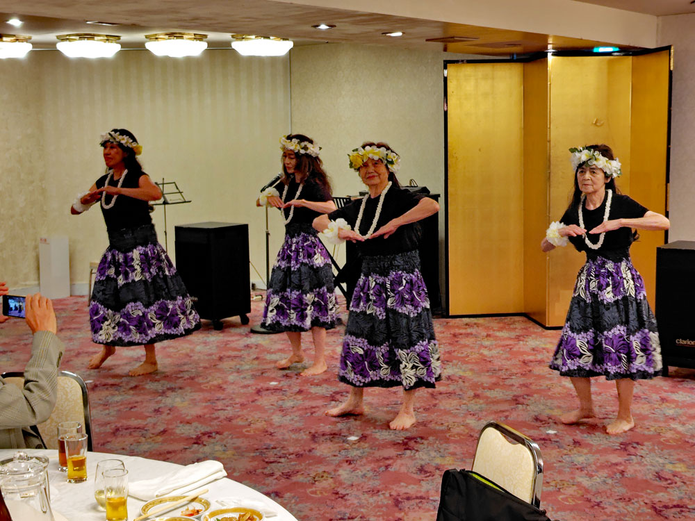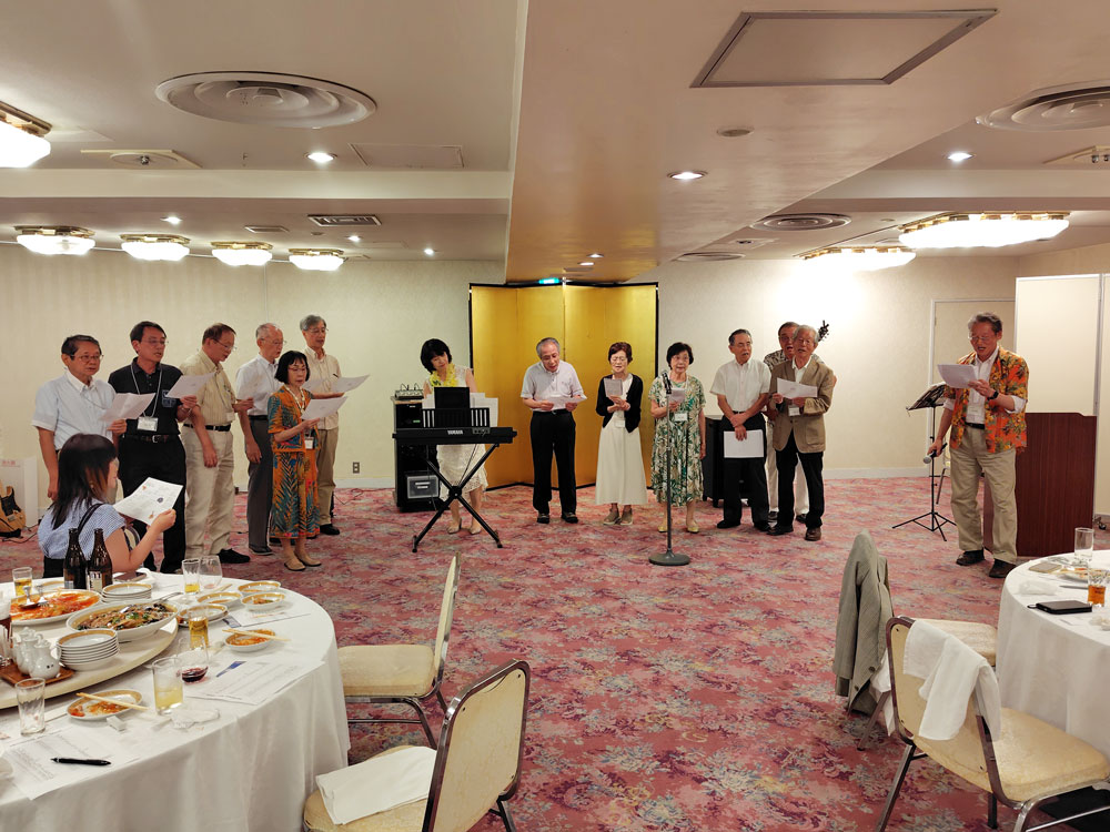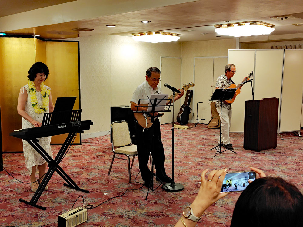 松井さんによるギター独奏「アルハンブラの思い出」、古曳さんのギターと歌「青葉城恋歌」、平野さんと塙夫妻による「青春」、塙(宏)の「白いパラソル」、そして音楽愛好会全員による「芭蕉布」、これは昨年お亡くなりになった大野正道前会長が大好きだった歌なので心を込めて歌いました。