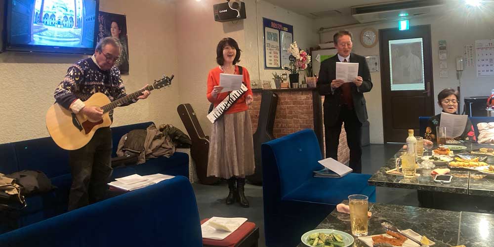 最初は冬にちなんだ3曲「冬の夜」「トロイカ」「冬の星座」を古曳さんの解説の後、三浦さんのリードと塙(敏比古)さんのギター伴奏で歌いました。