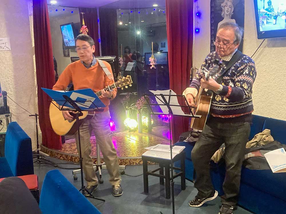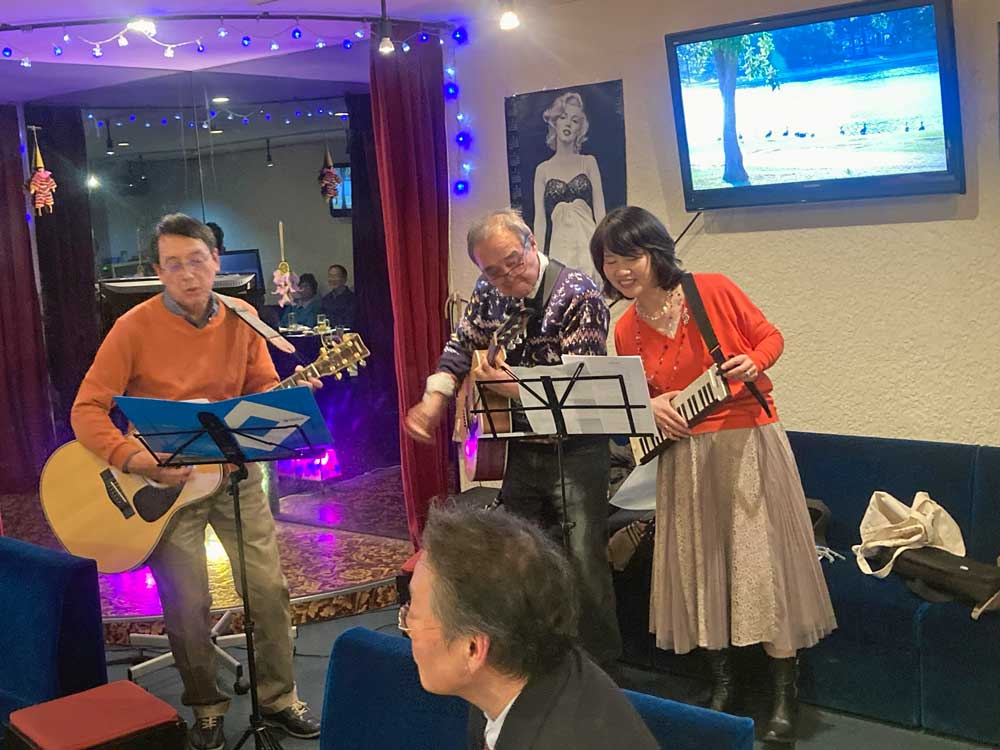 続いて平野さんと塙(敏比古)の2人でギターと歌「22才の別れ」、そして塙(宏美)の鍵盤ハーモニカが加わり、かぐや姫の「黄色い船」をコーラス付き歌と演奏のパフォーマンスで盛り上がりました。