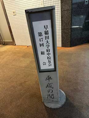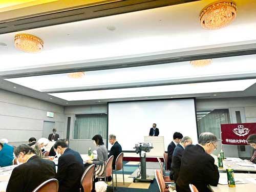 総会は、大野府中校友会会長の挨拶で始まり、2022年度事業報告など5議案並びに新年度役員体制を全会一致で可決承認しました。議事の終了後、早稲田大学東京三多摩地域担当の宇佐美雄蔵課長から、大学の現状報告を含めてご挨拶を頂き、14時30分頃、総会は閉会しました。