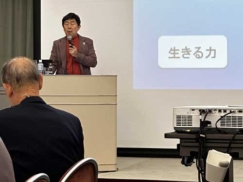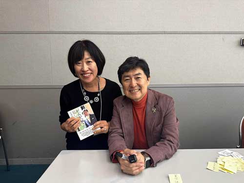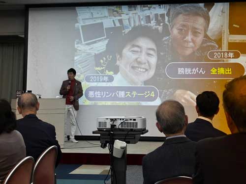 15時から開始された講演では、元フジテレビアナウンサーの笠井信輔氏(1987年商学部卒)に「生きる力、がんステージ4からの生還」と題してお話しを頂きました。笠井氏は、フジテレビを定年4年前の56歳で退職し、フリーアナウンサーとして独立しましたが、わずか2か月後に、血液のがん「悪性リンパ腫」ステージ4の告知を受けました。厳しい闘病の末、寛解状態まで復活した経験談をユーモアを交えてお話しされる笠井氏に、会場は魅了されました。講演後、著作「がんがつなぐ足し算の縁」(中日新聞社刊)のサイン会が行われ、著作は、あっという間に完売いたました。