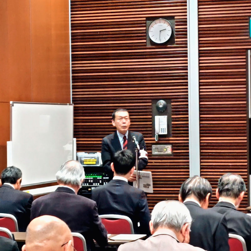 第1部総会は日比野悦久常任幹事の司会により進行。当日は大野正道会長がご欠席だったことから、鈴木正明副会長から冒頭挨拶があり、参会への謝辞が述べられた後、楽しい一時を過ごしてほしいと述べられました。