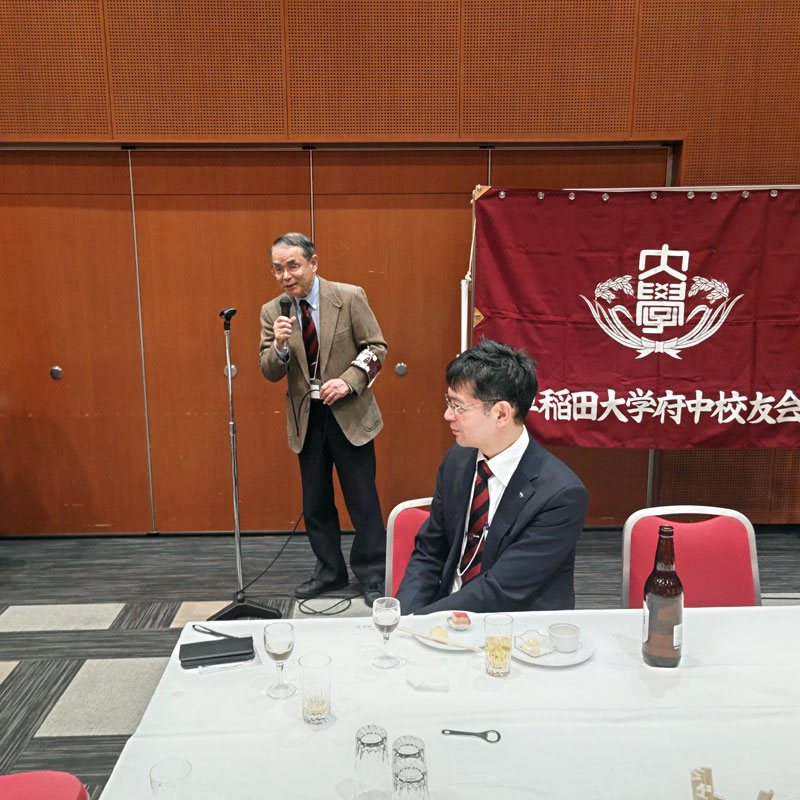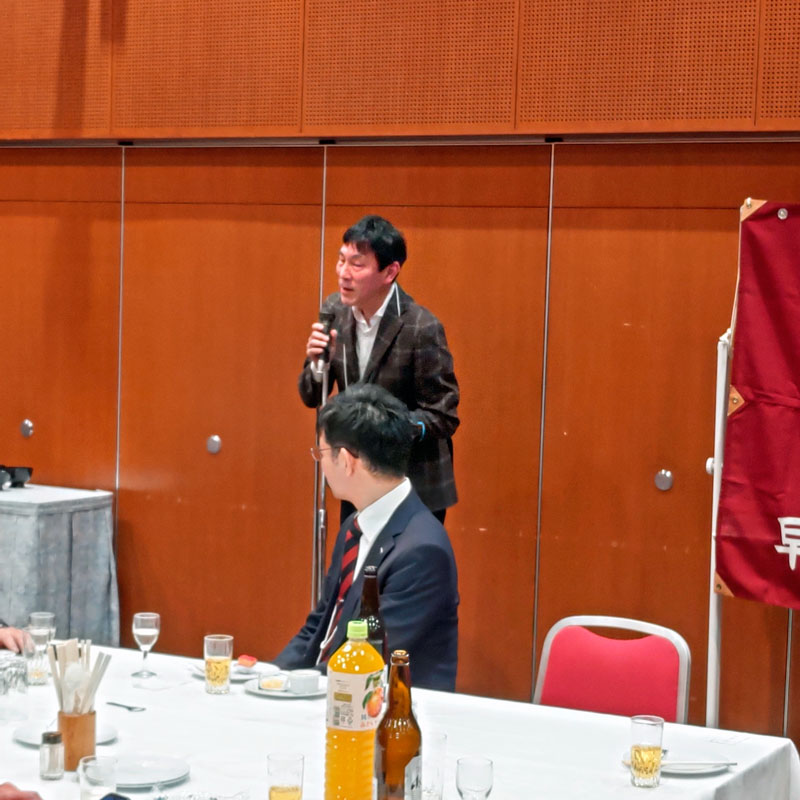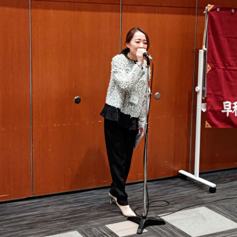 会の締めには岡野勝会員のパフォーマンスにより参加者全員で校歌「都の西北」を斉唱。最後に、新事務局長に就任された西村弘美さんによる閉会挨拶でお開きとしました。